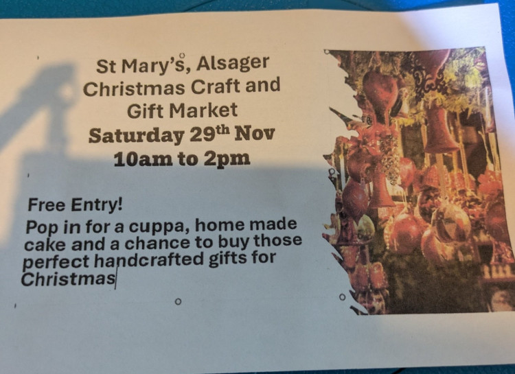 St Mary's Magdalene's Church in Alsager has a Christmas Craft and Gift Market from 10 am until 2pm. A chance to pick up some handcrafted Christmas gifts.
