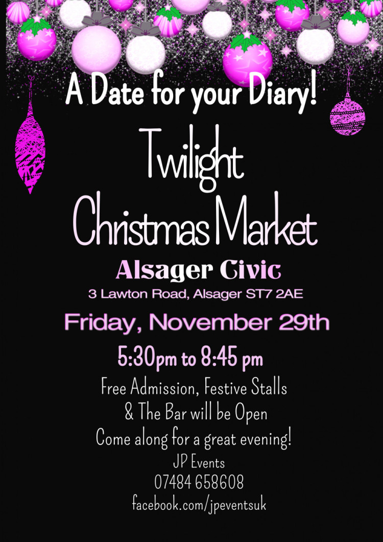 Fancy some Christmas shopping? It's the Twilight Christmas Market at Alsager Civic from 5.30 pm until 8.45 pm. Free admission, festive stalls and the bar is open.