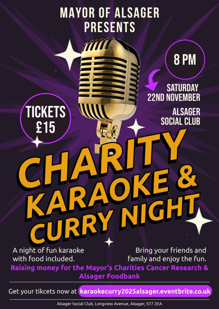 The Mayor of Alsager, Councillor Michael Unett, has his charity karaoke and curry night at Alsager Social Club in Longview Avenue. Tickets are £15.