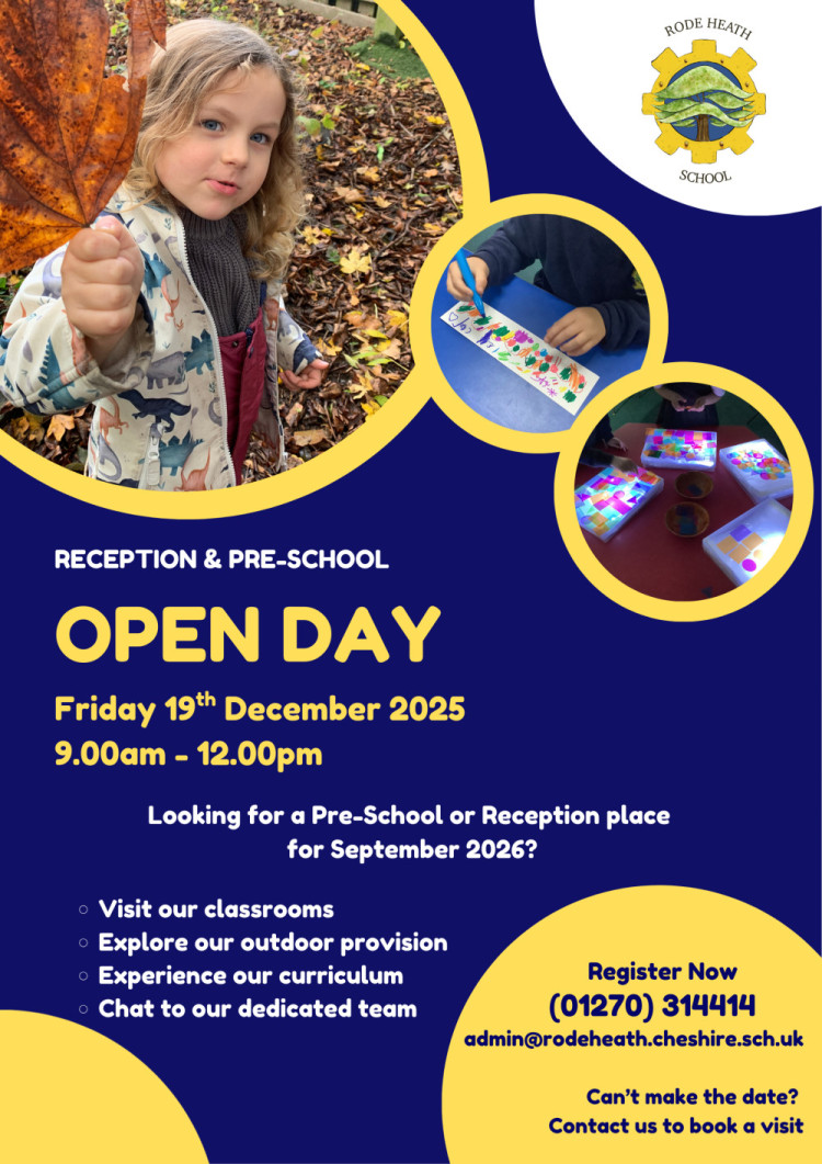 Rode Heath School's reception and pre-school has an open day from 9 am until 12 noon. All welcome.
