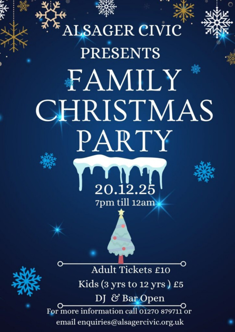 Alsager Civic has its family Christmas party. Join them for a Christmas party full of fun, games plus lots of dancing! Doors and bar open at 7pm.