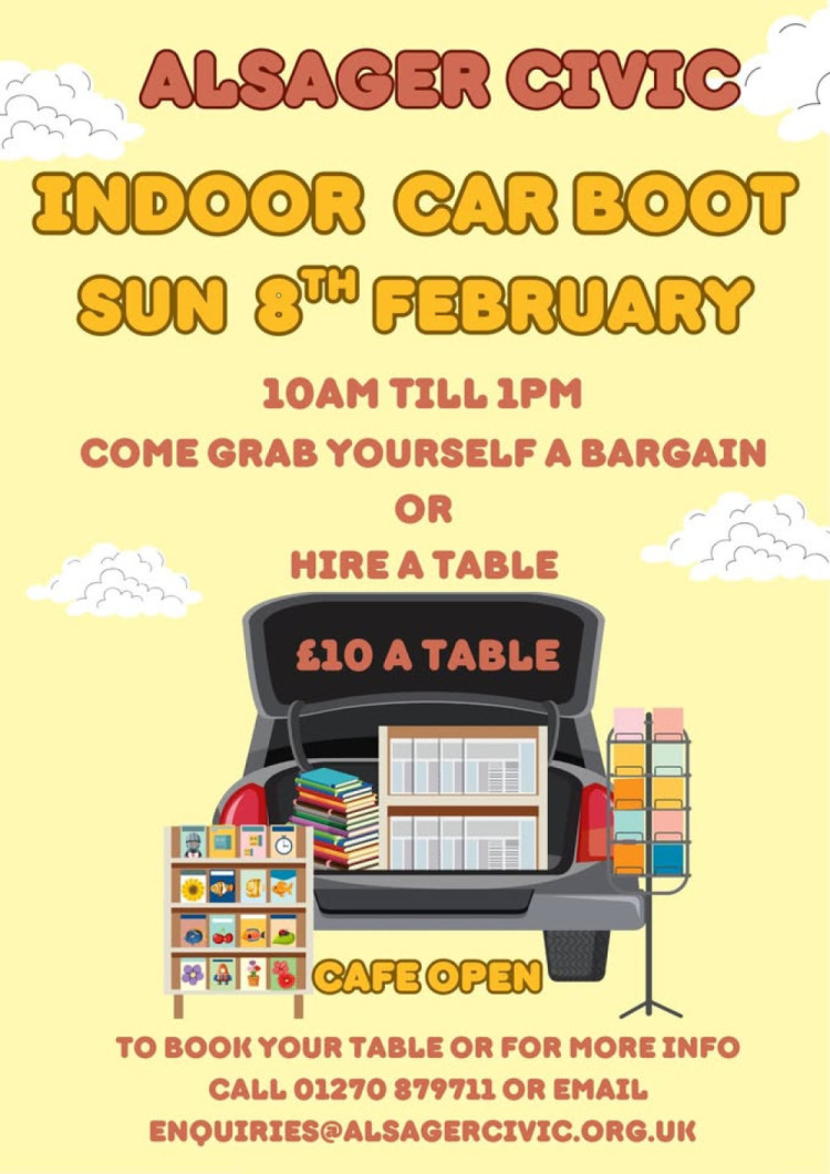 There will be plenty of bargains up for grabs at Alsager Civic's indoor car boot sale from 10 am until 1 pm. Sadly all tables are sold out but don't forget to go along and check out the bargains! It's inside so it doesn't matter about the weather - you'll be warm and cosy and as you browse and the cafe is open to grab something to eat and a coffee!