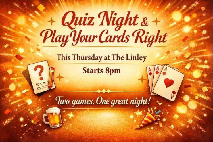In the evening, The Linley Tavern has a fun evening lined up - quiz night and 'play your cards right' starting at 8 pm. All welcome!