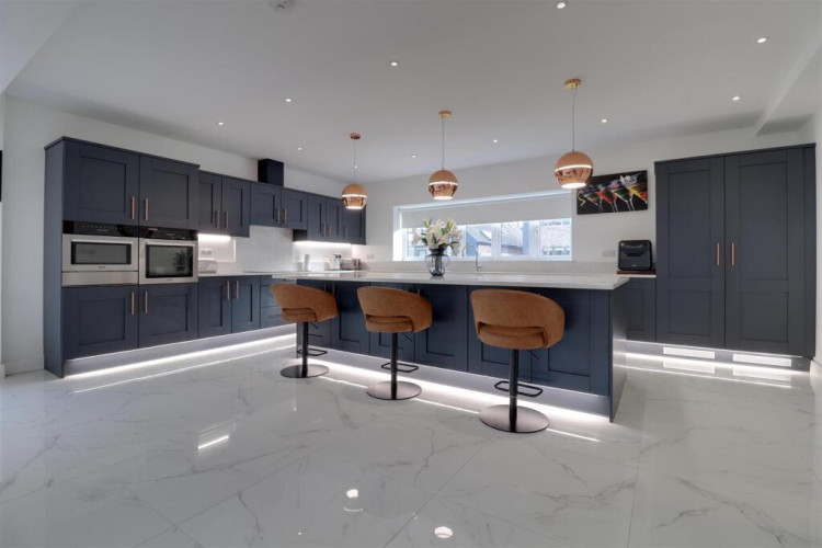 Underfloor heating. Two sets of bi-fold doors opening to the side and rear elevations. Inset spotlighting. Range of wall, base and drawer units with Quartz work surfaces over incorporating a stainless steel 1.5 bowl sink unit with drainer and Quooker mixer tap. A range of integrated appliances including a Miele oven and microwave/oven, Neff five ring induction hob with extractor oven, Neff dishwasher and Blomberg American style fridge freezer.