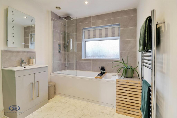 Three piece suite comprising a low level WC with push button flush, vanity wash hand basin with mixer tap and storage cupboard below and a panelled bath with rainfall shower having rinser attachment. Double glazed frosted windows to the side and rear elevation. Heated towel rail.