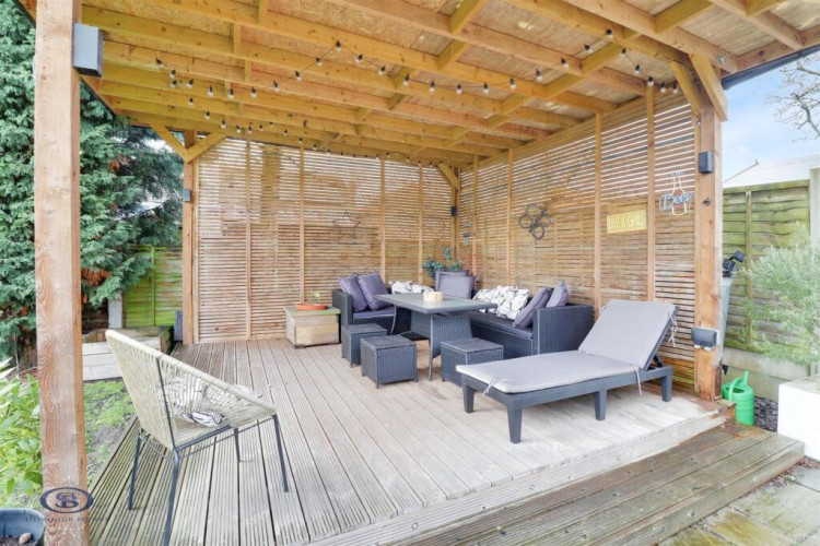 A paved pathway leads to the rear of the garden with a paved patio area with a covered decked area perfect for outside entertaining.