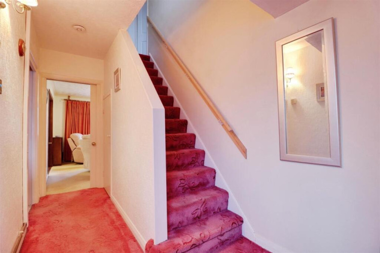 Fitted carpet, UPVC double glazed window, wall light point, radiator, under stairs storage cupboard.