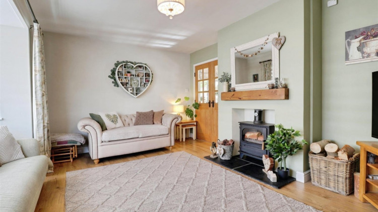 There are also double doors which open into the lounge at the front of the property, which features an extended bay window and a log-burning stove.