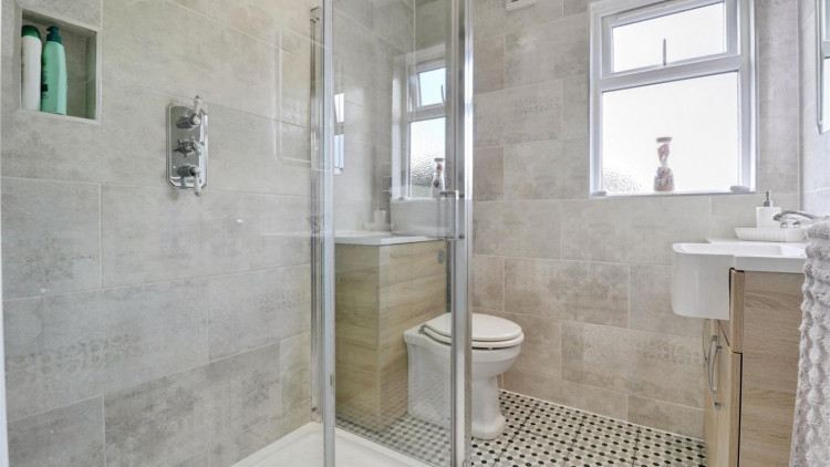 Tiled flooring, tiled walls, UPVC double glazed window, downlights, extractor fan, feature towel radiator, W/C, wash basin with vanity unit, shower cubicle.