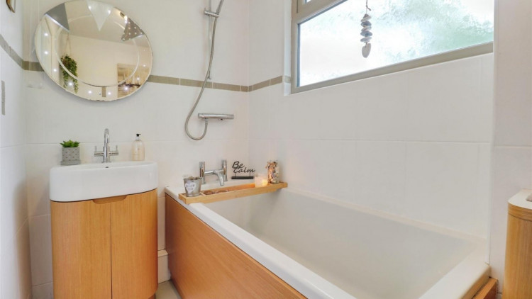Tiled flooring, tiled walls, UPVC double glazed window, ceiling light point, chrome towel radiator, W/C, wash basin with vanity unit, bath with overhead shower.