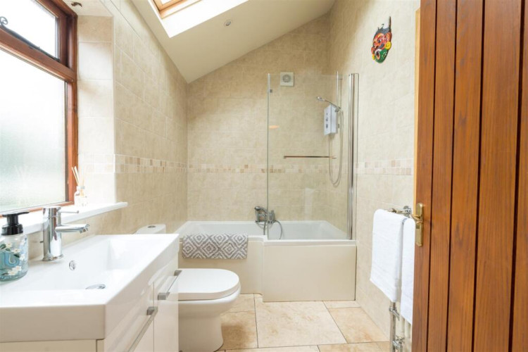 With tiled flooring, tiled walls, double glazed frosted window to side elevation, Velux window, spotlighting and heated towel radiator.
