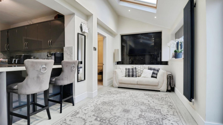 Maximum measurements (L-Shaped Room) - Laminate flooring, two UPVC double glazed windows and French doors leading to the rear garden, two Velux skylight windows, ceiling light point and downlights.