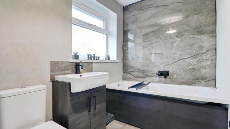 Tiled flooring, two UPVC double glazed windows, ceiling light point, feature towel radiator, W/C, wash basin with vanity unit, bath, separate walk-in rainfall shower.