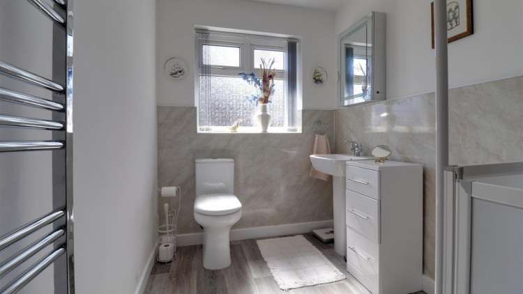 Three piece suite comprising a low level WC with push button flush, pedestal wash hand basin and a shower cubicle with shower over. Heated towel rail. Double glazed frosted window to the rear elevation. Storage cupboard housing the wall mounted gas central heating boiler.