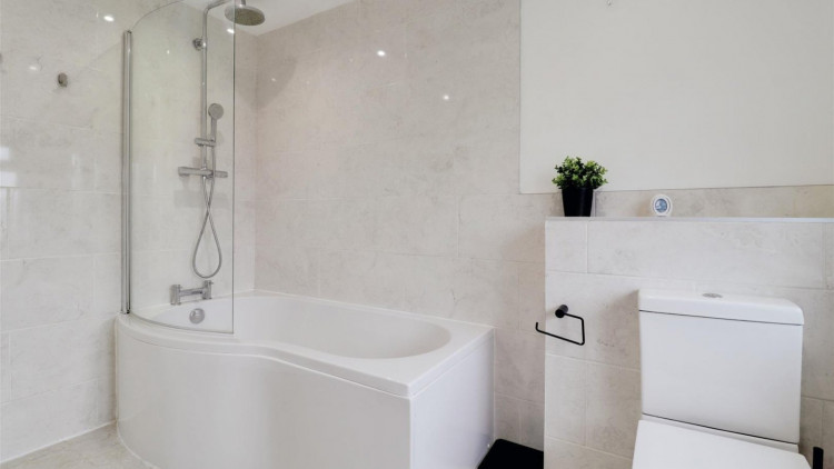 Three piece suite comprising a low level WC with push button flush, pedestal wash hand basin with mixer tap and a P-Shaped bath with mixer tap and rainfall shower over. Double glazed frosted window to the rear elevation. Double panel radiator.